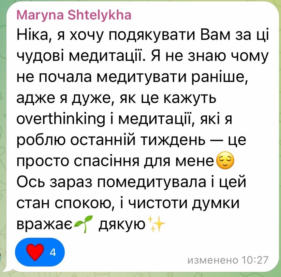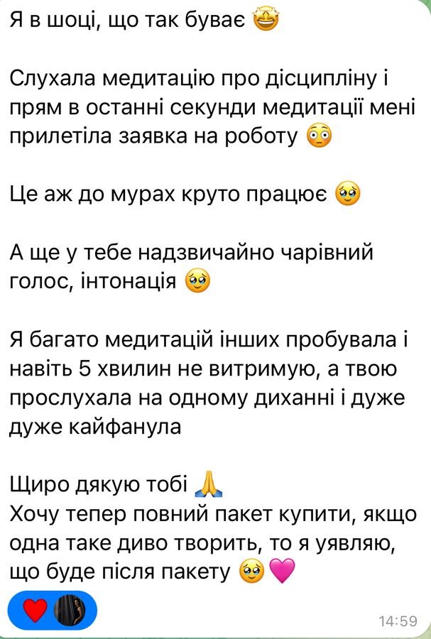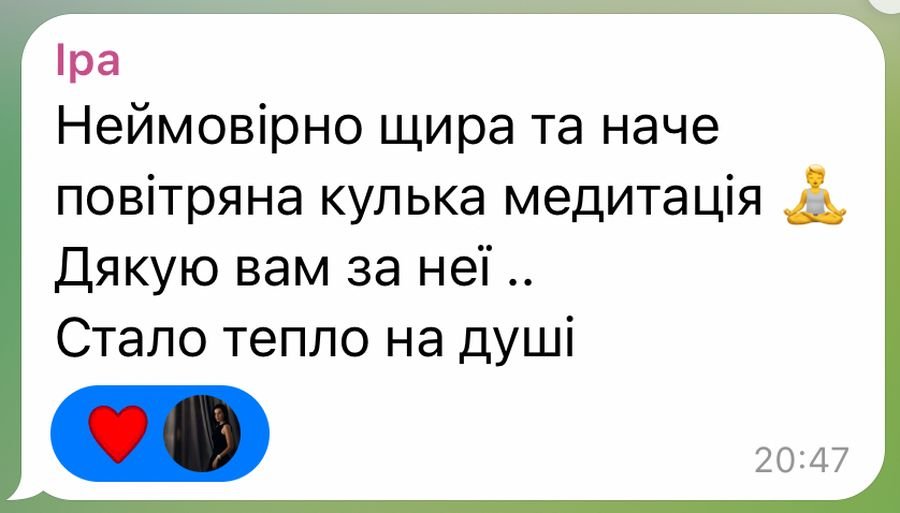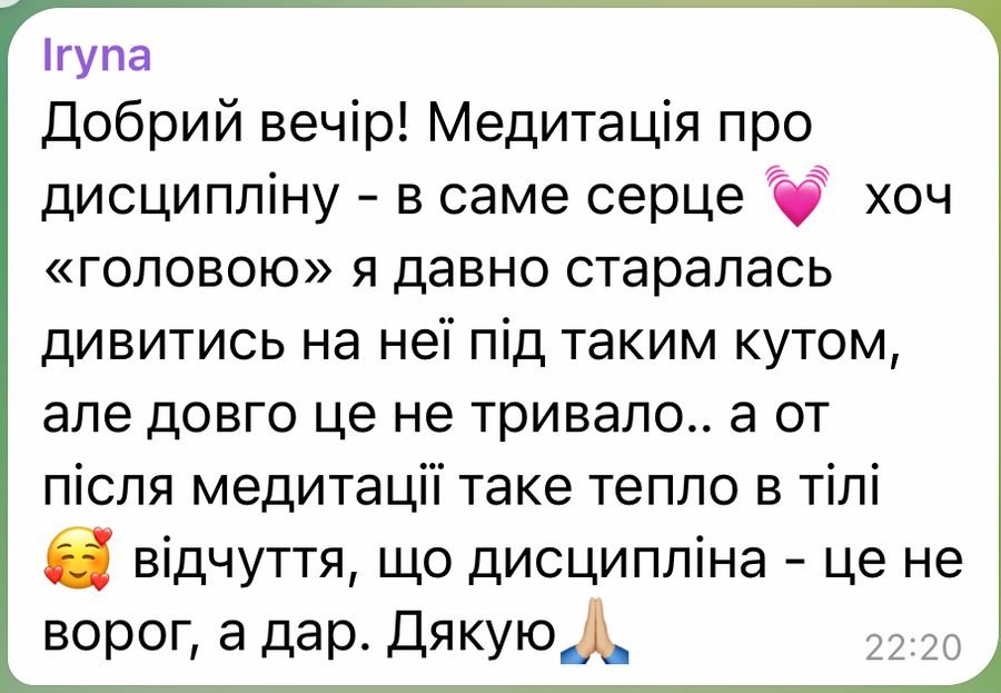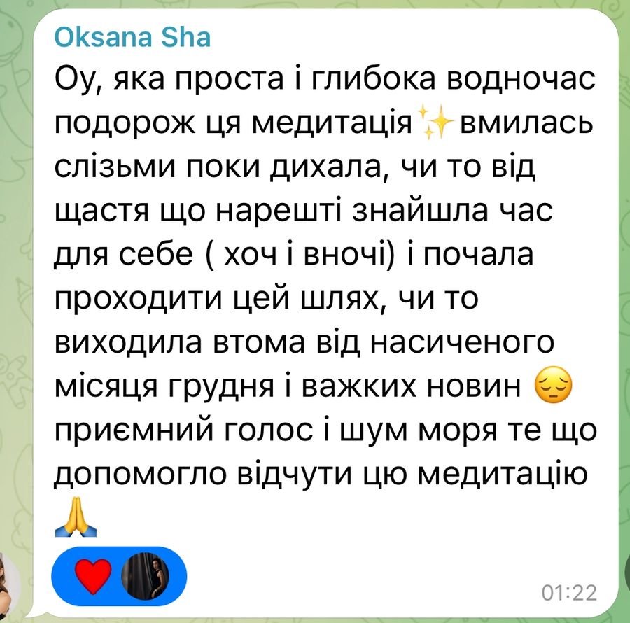 Всі слова, паузи, метафори і вправи які містяться в моїх медитаціях і подкастах – не випадкові. Кожен елемент має своє значення і мету. Але ти почуєш лише кінцевий результат і відчуєш ефект на собі через власний стан!